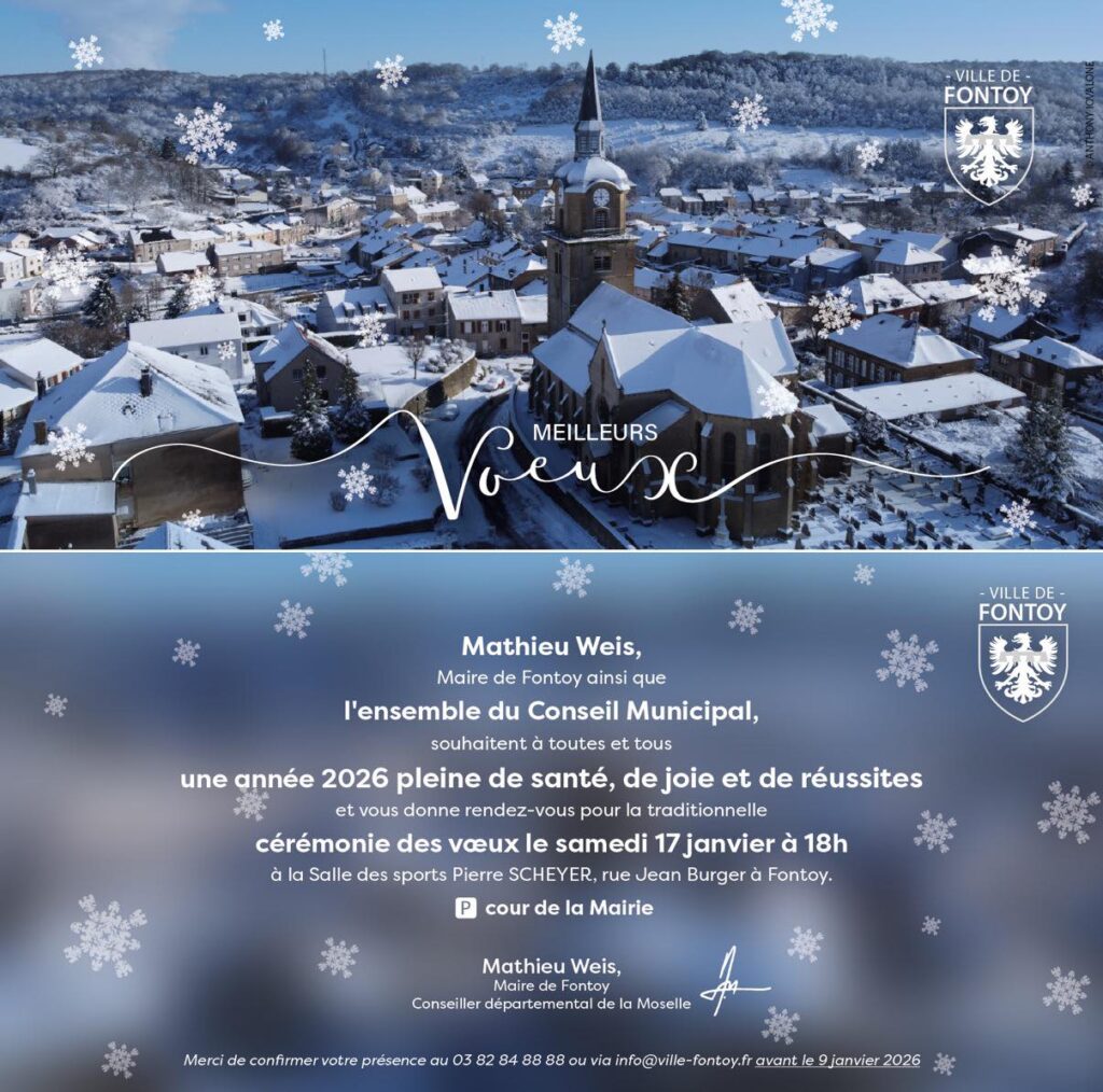 Le Maire Mathieu Weis et l’ensemble du Conseil municipal ont le plaisir de vous convier à la cérémonie des vœux, qui aura lieu le samedi 17 janvier 2026, à 18h à la salle Pierre SCHEYER, rue Jean Burger.